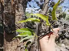La superficie de los tallos presenta cicatrices de las hojas caídas; las hojas pequeñas alargadas, pecioladas,helicoidales y densamente agrupadas en los ápices de las ramas de la copa ramificada. Dichas hojas tienen más liso y brilloso de color verde oscuro, envés de color verde claro opalescente.