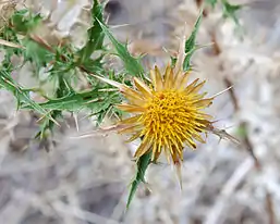 El cardo cuco tiene las flores (flósculos) amarillas. Las hojas, semiabrazadoras, están armadas con espinas en el margen. La planta es perenne y está provista de un tronco sorprendentemente grueso y profundo.