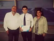 ![]() Carlos José Lapola Rodríguez, alcalde municipal de Esquipulas por el período 2012-2016 (izquierda), junto a la Síndico Primero Alma Morales de Morales (derecha) y un estudiante (centro). | ||