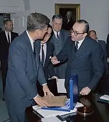 En enero de 1963 Muñiz viajó a Estados Unidos, en una misión para discutir la situación económica y financiera argentina con el presidente John F. Kennedy. Muñiz buscaba ayuda de emergencia, especialmente con el fin de renovar un crédito standby del FMI.[7] Junto con el embajador argentino Roberto Alemann, le denunciaron que la cúpula militar amenazaba al gobierno de Guido en caso de que la economía no mejorase. Posteriormente rectificó sus dichos al reunirse con el secretario de Estado Rusk.[7] Al mismo tiempo, en agradecimiento al apoyo argentino en la crisis de los misiles, Muñiz fue recibido con honores propios de un Jefe de Estado por parte de Kennedy y Rusk.[8]