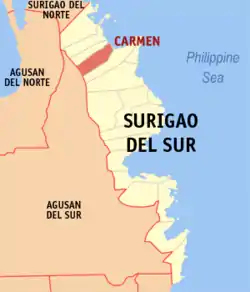 Carmen es un municipio filipino de quinta categoría, situado en la parte nordeste de la isla de Mindanao. Forma parte de la provincia de Surigao del Sur situada en la Región Administrativa de Caraga, también denominada Región XIII. Para las elecciones está encuadrado en el Primer Distrito Electoral.