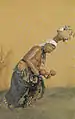 Son tres músicos de la Danza del Venado, uno toca la jícara de agua con una baqueta, los otros dos raspan dos tiras de madera (una lisa y otra labrada), una con otra sobre una calabaza.