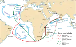 - Esta obra contiene una traducción derivada de «Carreira da Índia» de Wikipedia en portugués, publicada por sus editores bajo la Licencia de documentación libre de GNU y la Licencia Creative Commons Atribución-CompartirIgual 3.0 Unported.