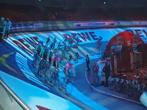 La prueba principal es la carrera de Madison, en la que los dos miembros del equipo están en la pista al mismo tiempo. Un de ellos coge su turno en la carrera de relevos, mientras que el otro va hasta el siguiente relevo. Los relevos se hacen tocando la espalda o la mano.
