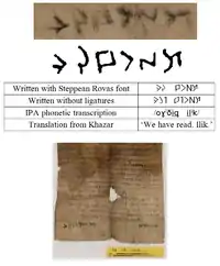 La carta contiene el único registro escrito del idioma jázaro existente a día de hoy, la frase de una palabra "lo he leído". Parece que sea como una fórmula de aprobación de un magistrado jázaro (se han hallado inscripciones similares, en latín y griego en el Imperio Bizantino en el mismo periodo.)