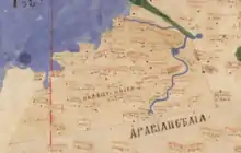 1100s | Mapa de Tournai | Desconocido | Copia del Siglo XII de un mapa de Asia al que acompañaba un manuscrito en Latín Liber De Situ Et Nominibus Locorum Hebraeorum. (Libro de Lugares y Nombres Hebreos). Es un trabajo del siglo IV a V de San Jerónimo.[26] [27] | No se muestra ningún nombre de región | ![]() |