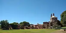 Siguiendo el eje de entrada al recinto, y distanciado de él, se encuentra el núcleo fundamental del conjunto. Éste se compone de una iglesia y tres claustros con las distintas dependencias y cronologías.