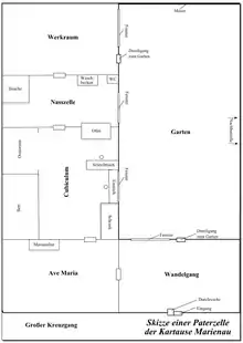 Marienau es una "doble cartuja", esto es, que alberga 24 monjes en vez de los habituales 12. Los edificios, como exigió el padre cartujo Marianus Marck,[2] se organizan en cinco áreas bien definidas: