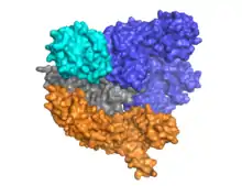 Cas9 presenta una arquitectura bi-lobulada con el ARN guía situado entre el lóbulo alfa-helicoidal (azul) y el lóbulo de la nucleasa (cian, naranja y gris). Estos dos lóbulos están conectados a través de una sola hélice de puente. Existen dos dominios de nucleasa situados en el lóbulo de nucleasa multidominio, el RuvC (gris) que escinde la cadena de ADN no diana y el dominio de nucleasa HNH (cian) que escinde la cadena diana de ADN. De manera interesante, el dominio RuvC está codificado por sitios secuencialmente dispares que interactúan en la estructura terciaria para formar el dominio de escisión RuvC.
