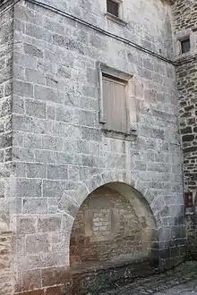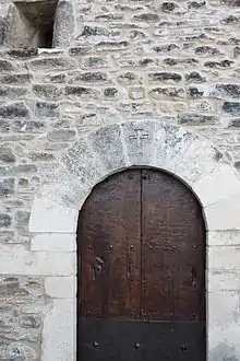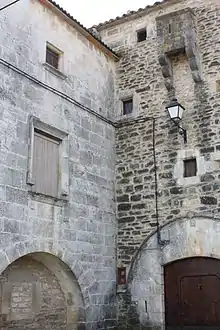 Sobre la puerta en el último piso de la torre hay un matacán sobre ménsulas lobuladas, muy frecuente en Sobrarbe,