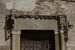 Se accedía a él por una puerta de tachones enmarcada en una portada de granito. Esta portada la forma un gran dintel monolítico rematado por una cornisa de cordón y bolas que se prolonga en los costados tras pasar unas mensulillas, estas, a su vez, descansan sobre medias columnas adosadas a las pilastras que forman las jambas. Ambos elementos de soporte (columna y pilastra) llevan un capitel, de mármol o caliza, con motivos vegetales. El tipo y decoración es esta portada la sitúan cronológicamente en el siglo XV. La portada se enmarca en una pared de sillería de regular calidad, cubierta por un revestimiento parecido al que continúa más arriba, en los dos cuerpos superiores. Hay un poyo de granito a cada lado de la puerta.[1]