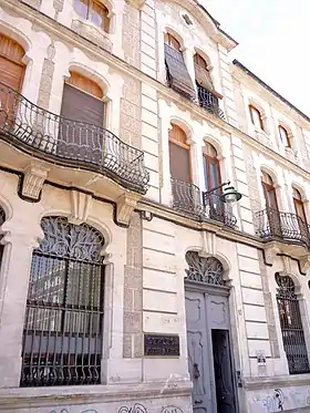 La fachada principal está compuesta por sillares divididos en franjas en vertical, delimitadas por pilastras. En el conjunto arquitectónico destaca la composición simétrica de su fachada. La herrería presenta una decoración de tipo floral en las barandillas de los balcones y en las rejas de los bajos. La puerta principal es de hierro, también con decoración floral.
