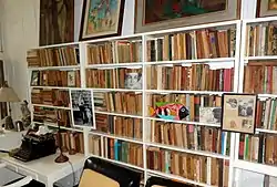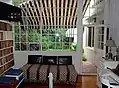 Puede apreciarse el jardín principal de la casa, una pequeña sala de estar que cuenta con dos bibliotecas colmadas de libros en español y en inglés, y un living rodeado de estanterías con distintas publicaciones. [2]
