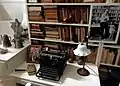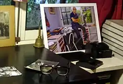 - La Remington y dos fotos: del escritor con la camiseta de su equipo de fútbol predilecto (Estudiantes de la Plata) y otra con su esposa Matilde