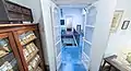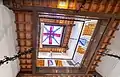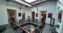 El patio central de la vivienda está cubierto con una montera de cristales de colores, marca el eje central de la casa y a su alrededor se distribuyen las habitaciones.