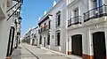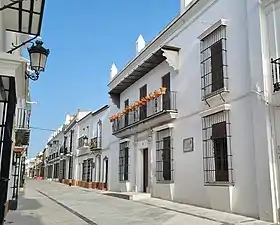 La fachada principal es de arquitectura andaluza con predominio de elementos barrocos tardíos. Las ventanas de hierro forjado, balcón corrido, y el tejaroz o guardapolvo de pizarra gris.