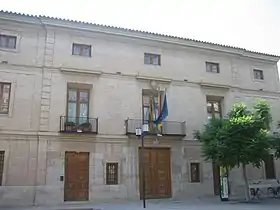 La fachada es de estilo neoclásico y está dividida verticalmente en tres tramos con total simetría. Los dos tramos extremos presentan vanos rectangulares de menores dimensiones y están separados del central mediante cadenas que unen el piso principal con la planta superior. El cuerpo central tiene tres vanos por planta. En parte central de la planta baja se encuentra la puerta adintelada sobre la cual hay un escudo. Flanqueando la puerta principal hay otras dos, también adinteladas pero de menores dimensiones.[2][1]