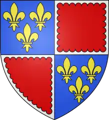 Blasonamiento | Acuartelado : en el 1º y 4º, de azur trae tres flores de lis de oro ; al 2º y 3º, de gules liso | |