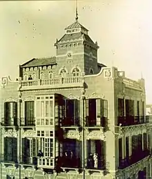 Está construido con paredes de mampostería de piedra local y ladrillo macizo, con vigas de hierro y bovedillas del mismo ladrillo.[3] Consta de planta baja y dos plantas, más los cuartillos de la azotea, que antaño contaban con un bello tejado a dos aguas, hoy perdido. En él destaca su fachada principal, con el mirador central de dos plantas, hoy con carpintería de aluminio, que se encuentra encima de la puerta de entrada y flanqueado por balcones con rejerías que se extienden por las dos plantas y cuyas ventanas llevan molduras sobre dinteles.[1][4][5][6]