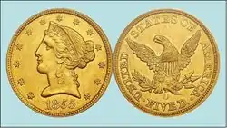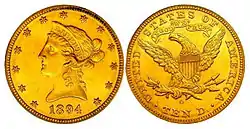 En 1866, se agregó una cinta sobre el águila con el lema In God We Trust a las piezas de oro de $10. Durante 1894 se efectuó una de las mayores acuñaciones de Águilas de la ceca de Nueva Orleans. |