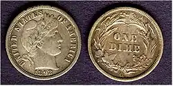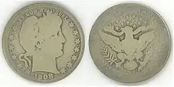 La mayoría de monedas Barber tuvieron amplia circulación, motivo por el cual, este ejemplar se encuentra tan gastado. | |