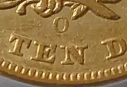La marca "O" de la ceca, está localizada dentro de la guirnalda. Se dice que esta moneda fue la primera acuñada en Nueva Orleans. |
