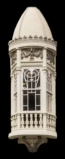 Sus fachadas están dispuestas en torno a un mirador esquinado, apoyado sobre una ménsula en abanico y compuesto por varias caras unidas con unas columnillas circuladores que sostienen un entablamento con un festón, en el que aparece un águila, dando paso al «coup de fouet», un remate ondulante en semicono que se inicia con una crestería y que alberga un festón pequeño. Estas fachadas están compuestas por un balcón central, sobre cuya ventana se sitúa una moldura con un festón, rodeada de balconadas, sobre cuyas ventanas se sitúan molduras con leones, ambos con balaustradas y delimitados por cenefas verticales con motivos vegetales. Todo se culmina con balaustradas, a excepción del centro, donde se sitúan remates ondulantes adornados con un festón.[1][6][7][8][9]