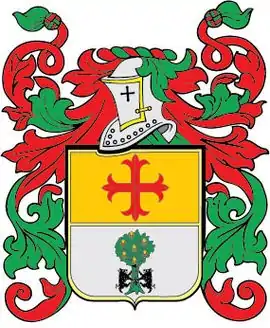 Escudo cortado: 1º, en oro, una cruz flordelisada, de gules, y 2º, en plata, una encina de sinople, frutada de oro, y dos jabalíes de sable, empinados al tronco. En campo de azur, una cruz de plata cargada de cinco armiños de sable.