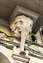 Su fachada, que presenta una composición simétrica en cada una de sus plantas, está compuesta por una planta baja de vanos de arcos escarzanos que da paso a una principal, con un mirador central —sostenido por ménsulas con forma de cabezas de elefante, que le dan el nombre y compuesta por pilastras jónicas—, flanqueado hasta el piso superior, por balcones, tapado por árboles, de exquisitas rejerías de forja de diseño secesionista, con ventanas enmarcadas y con bellas molduras sobre sus dinteles, y con un florón en el remate central.[2]