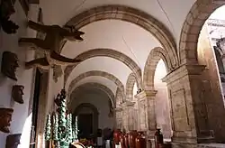 En su interior posee dos patios; el principal de planta cuadrangular presenta arquerías de medio punto presididas por contrafuertes, sus corredores circundantes se hallan techados con bóvedas de lunetos. Las distintas salas se distribuyen a su alrededor y presentan bóvedas de cañón o techos de viguería de madera. El patio secundario de planta cuadrangular es austero y se encuentra presido por muros de cantera donde se asoman algunas ventanas rectangulares. El cubo de la escalera principal de cuatro rampas se halla techado con una bóveda de pañuelo donde están trazados casetones.
