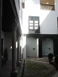 • La escalera principal en el siglo XVI, contiene decoración pictórica mural, representando a las virtudes: Caridad, Esperanza, Justicia y una Inmaculada.
