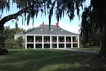 Otro tipo de casa, la cabaña criolla, provenía de las áreas a lo largo de la Costa del Golfo y sus ríos asociados que antes formaban parte de Nueva Francia. Siempre fue de un piso y medio, con un techo a dos aguas y, a menudo, tenía ventanas con buhardillas en el piso superior. Sin embargo, acomodaba un porche delantero de ancho completo debajo del techo principal, con puertas o ventanas de foque que se abrían desde todas las habitaciones hacia el porche, y generalmente se elevaba muy por encima del suelo en un sótano o pilares completamente elevados. Era una forma común para muchas casas de plantaciones tempranas y casas adosadas por igual en los tramos bajos de Alabama, Luisiana y Misisipi.[15]