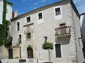 El edificio, de estilo renacentista, era en su origen una casa señorial de la familia noble Carvajal. La tradición local señala que esta fue la casa natal del cardenal Bernardino López de Carvajal y Sande, uno de los principales líderes religiosos de la época de los Reyes Católicos. En el exterior destaca su fachada con esgrafiados, en la cual se halla su portada de acceso, de medio punto con grandes dovelas de sillería; sobre esta portada se ubica una ventana con rejas sobre la cual hay tres escudos de armas ovales en altorrelieve, de los cuales el del cardenal se ubica en la parte superior central y los otros dos un poco más abajo a los lados.[3]