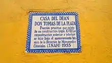 Su nombre obedece al cargo de su primer propietario y constructor, Tomás de la Plaza y Goes, deán de la catedral de Puebla. De acuerdo al Instituto Nacional de Antropología e Historia (INAH), institución que resguarda y administra el inmueble que hoy es un museo, la casa del Deán es «un magnífico ejemplo de lo que fueron algunas de las mansiones en el primer siglo de vida de la Ciudad de Puebla».[2] Es considerada la primera construcción civil de la ciudad, e incluso se ha llamado "La Capilla Sixtina del Nuevo Mundo"[3][4][5]
