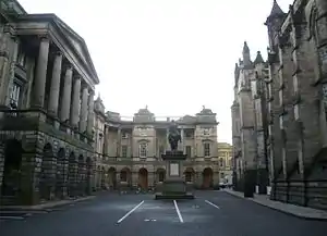 ![]() Plaza del Parlamento, en Edimburgo, mostrando la sociedad de los Writers to Her Majesty's Signet (Abogados del Sello de su Majestad) detrás de la estatua de Carlos II. La entrada a la Casa del Parlamento está en la esquina, del lado izquierdo de este edificio. | ||
