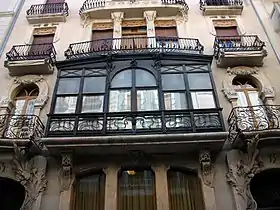 La composición de la fachada es interesante por su complejidad, tanto de composición como de ornamentación. Arranca con una planta de semisótano que se refleja en tres huecos centrados, rematados por arcos de herradora rebajados, tan del gusto de la composición modernista. Sobre ellos y con la misma distribución, el hueco tripartito del entresuelo. Dos grandes puertas coronadas con arcos de herradura, flanquean las dos plantas descritas, unificando la basa del edificio e iniciando la composición de la planta principal, de balcones laterales y gran mirador central, en el que se apoya el balcón de planta segunda, flanqueado por balcones laterales. En esta planta, los cargaderos de los huecos son adintelados. En la planta tercera y superior, los balcones son de planta curvada en sus extremos, el hueco central pasa a ser doble y da lugar al motivo de mosaico curvo superior.