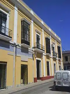 La fachada presenta un sobrio esquema neoclásico ordenado horizontalmente en dos plantas delimitadas por una moldura, y verticalmente en siete vanos separados por pilastras. En cada vano de la planta superior se abre un hueco que alternativamente aparece como balcón o como cierro enrejado, de tal modo que en el vano central se sitúa la puerta de la casa y en la planta superior el balcón principal, que difiere de los demás por sustentarse sobre dos ménsulas de corte clásico. El alzado del inmueble se remata con una potente cornisa que corre a lo largo de todo el frente de fachada y un pretil. En ambos extremos de la fachada y sobre los vanos entre pilastras aparece un aparejo de sillares decorativo. Tiene patio interior cuadrado de aproximadamente 6 x 6 metros de longitud con cuatro columnas de mármol de orden toscano sobre las que apoyan cuatro arcos rebajados o escarzanos.[2]