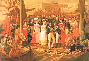 Al llegar á Alcalá se dirigió S. M. á la casa del marqués; mas como hacia muy poco tiempo que se había recibido el aviso, la cena aún no estaba pronta para servirla, y solo lo que estaba puesto era la mesa para las reales personas en el mismo cuarto en donde entraron a descansar porque sin duda la casa no tiene otro mayor. Apenas acabada la cena, el general que mandaba las tropas se aproximó á S. M. y le expuso la necesidad de ponerse inmediatamente en camino. El rey obedeció y entró de nuevo en su coche.[5]