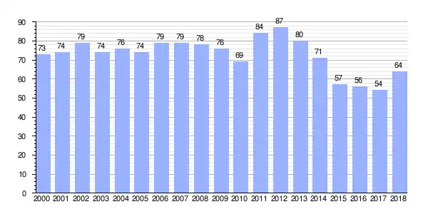Gráfica de evolución demográfica de Casanova entre 2000 y 2018 |