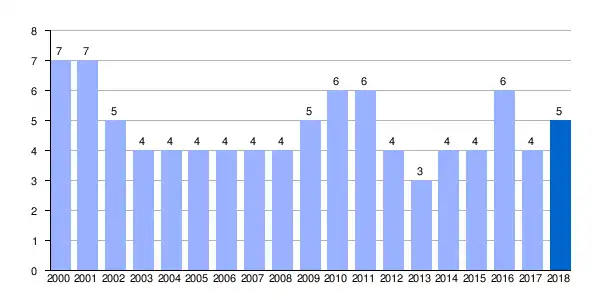 Gráfica de evolución demográfica de Casas de Madrona[1] entre 2000 y 2018 |