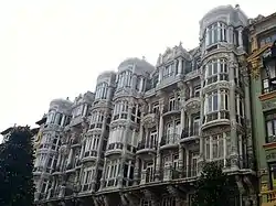 El edificio, que en realidad mira a dos calles (Uría e Independencia pero sin hacer esquina), fue levantada entre 1913 y 1917 por el maestro de obras Ulpiano Muñoz Zapata. Supuso un reto inmobiliario para la calle y antesala de los grandes edificios que se construyeron en la avenida a partir de los años 30, sustituyendo a chalés y pequeñas mansiones. Dentro de un estilo modernista-alabeado, su fachada recibe la influencia barroca por la gran cantidad de ornamentación, destacando muy especialmente las jambas, miradores y ménsulas, las cuales simulan motivos mitológicos que parecen sostener el edificio.