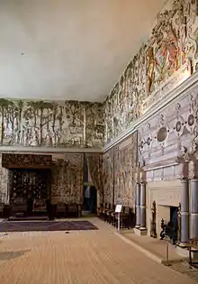En el interior, la mayoría de las casas todavía tenían una gran sala de estilo medieval, a menudo con una pantalla de piedra o madera en un extremo. Pero esta solo era utilizado para comer por los sirvientes, excepto en ocasiones especiales. La sala principal para que la familia comiera y viviera era la gran cámara (great chamber), generalmente en el primer piso (por encima de la planta baja), una continuación de los desarrollos medievales tardíos. En el siglo XVI, generalmente se agregaba una sala de retiro withdrawing room entre la gran cámara y el dormitorio principal, así como la larga galería. El parlour era otro nombre para una habitación más privada, y cada vez había más en las casas más grandes, donde la familia inmediata ahora comía normalmente,[Gir. 3] y donde podían retirarse por completo en climas fríos. Aunque el primer corredor moderno en Inglaterra probablemente se construyó en este período, en 1579, seguían siendo raros, y las casas seguían teniendo la mayoría de las habitaciones accesibles solo a través de otras habitaciones, con los espacios más íntimos de la familia al final de una suite.[6]