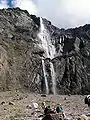La altura de la caída, está dividida en dos saltos, las capturas más importantes de una elevación de 281 m, es tan importante que el agua se vaporiza en una nube de aerosol. La corriente de aire de la cascada determina un microclima frío en los pies y mantiene un campo de nieve con un puente de nieve (que desaparece gradualmente con el aumento de las temperaturas). El flujo es muy variable, tan bajo como 6 m³ / s durante el verano y hasta 200 m³ / s durante las lluvias y nevadas, principalmente en invierno y otoño.[1]