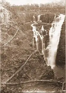 En 1902, tres hombres, Ted Baker, Jim McMillan y "Wattie" Joiner construyeron la escalera de madera que zigzagueaba desde la parte superior de la garganta hasta la orilla del agua. Toda la madera utilizada en esa peligrosa y gigantesca tarea fue tallada a mano con hacha y azuela por este trío. La escalera original se usó hasta 1932, cuando fue considerada insegura y fue parcialmente demolida.[3]