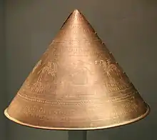 Casco Kegel con representación ecuestre. Bronce. Cremona, Región de Lombardía (Italia). Actualmente está en el Museo de Prehistoria e Historia Temprana, Berlín.