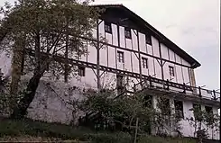 Se trata de un caserío de planta cuadrada de 20 x 20 m, dos plantas, bodega y desván situado en una ladera de gran pendiente. Cubierta a dos aguas de teja canal con gallur perpendicular a la fachada principal de orientación SE. La fachada principal se alza sobre 4 postes enterizos unidos por largas correas y refuerzos con tornapuntas. Posee también entramados intermedios en sentido vertical en su mayoría. A altura del forjado de la primera planta son visibles los extremos de la solivería. Todos los vanos están rellenos de mampostería raseada y pintada de color blanco. La composición es simétrica, poseyendo dos líneas de ventanas dispuestas a la altura de la primera planta y del desván. Sobre las ventanas del desván se sitúa el hastial cerrado con tablazón. La fachada se halla enmarcada entre dos esquinales de piedra sillar de arenisca.