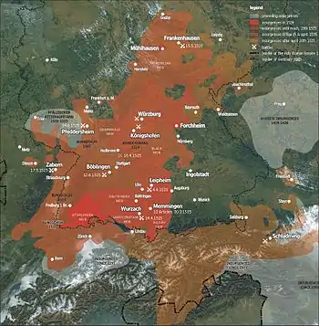 Los ejércitos desorganizados de campesinos fueron derrotados en la región de Wurzburgo por una coalición de la Liga de Suabia y otros aliados del obispo de Wurzburgo. Su resistencia y moral colapsaron debido a sus masivas pérdidas. Casimiro, cuyas acciones le merecieron el sobrenombre de "Bloodhound", ganó la delantera. Las poblaciones rebeldes, la mayoría de las cuales se rindieron sin resistencia, fueron víctimas de saqueos. Casimiro también devastó poblaciones en su propio territorio: incendió poblaciones enteras, y los rebeldes fueron ejecutados. Se reportó que había matado a 300 personas solamente en Feuchtwangen. En Kitzingen, quiso poner ejemplo: prometío al bailiazgo Luis von Hutten que las vidas de los residentes serían respetadas. Después de su rendición, sin embargo, los castigó severamente cortándoles los dedos índice y corazón de la mano derecha (los "dedos del juramento"), los cegó y envió al exilio. Su "capitán" Augistin apuñaló los ojos de 58 personas quienes habían dicho que "no querían volver a ver a un margrave" antes de la rebelión. Estos hechos fueron considerados incluso en ese tiempo como monstruosas atrocidades.[2] También castigó Rothenburg y consiguió concesiones territoriales de la ciudad. Informes contemporáneos claman que las plazas del mercado de Rothenburg y Schweinfurt estaban teñidas de rojo por la sangre de los rebeldes decapitados. Ya que Casimiro fue descrito como secuaz imperial, puede asumirse que actuaba de acuerdo a los deseos del emperador o la Liga de Suabia. Envió a su hermano, Juan Alberto, a Bayreuth a castigar la ciudad por su falta de apoyo cuando estaba contratando tropas. Solo cesó sus castigos cuando se supo en noviembre de 1526 que personas inocentes también estaban afectadas.