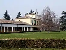 La fachada principal simétrica, enteramente enlucida como el resto de la estructura, se divide verticalmente en tres partes, de las cuales la central en un muy ligero voladizo; en el medio hay tres grandes portales de entrada precedidos por un pórtico, sostenido por dos macizos pilares en los extremos y por dos columnas rematadas con capiteles dóricos en el centro, que sostienen el balcón del piso superior; en este último hay tres ventanas francesas delimitadas por cornisa y arquitrabe superior, a semejanza de los vanos laterales; pares de hileras de cuerdas separan los tres niveles, mientras que un gran frontón triangular se eleva hasta la parte superior, en el centro del cual se encuentra un gran escudo de armas del Ducado de Parma, Piacenza y Guastalla en la época de la duquesa María Luigia.[12]