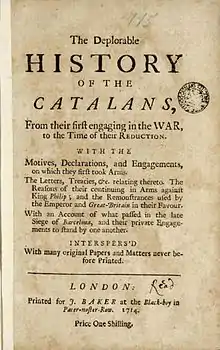 Por su parte, The Deplorable History of the Catalans, tras narrar lo sucedido durante la guerra, elogiaba el heroísmo de los catalanes: «ahora el mundo ya cuenta con un nuevo ejemplo de la influencia que puede ejercer la libertad en mentes generosas».[18]