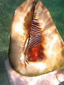 Concha grande y pesada, de hasta 301 mm de longitud.[2] Presenta escudo parietal triangular, amplio de color marrón anaranjado a rosado salmón con una mancha color marrón oscuro en el centro; dientes del labio externo color marfil y manchas marrón oscuro entre ellos; el último giro tiene tres hileras espirales de nudos y ornamentación reticular fina.[3]